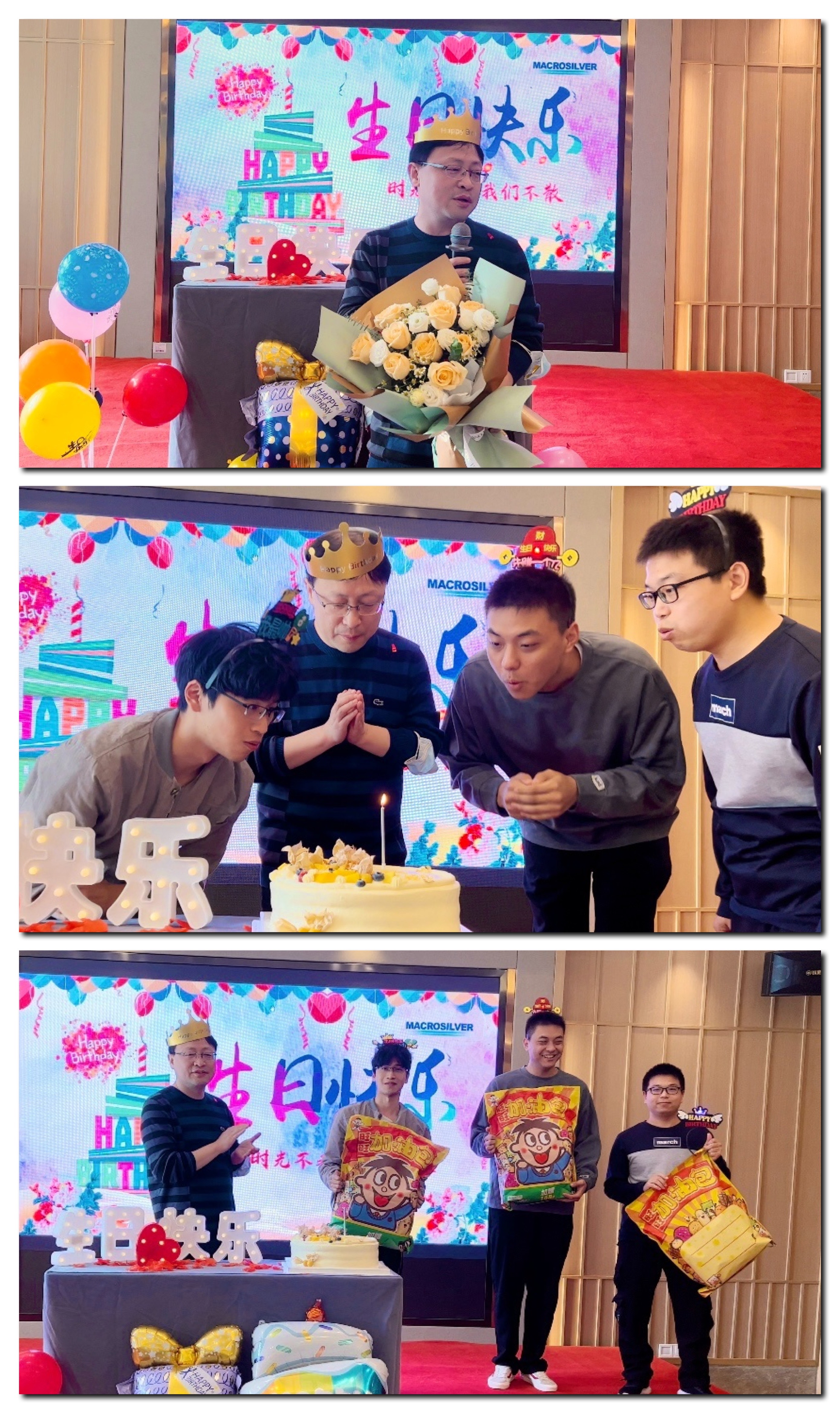老大激動(dòng)地接過鮮花,對(duì)大家精心準(zhǔn)備的驚喜表示感謝。期間還邀請(qǐng)了10月生日的其他小伙伴,一起上臺(tái)許愿,吹蠟燭。在輕松、歡樂的氣氛中,大家共享生日的喜悅。同時(shí),公司為每位壽星也準(zhǔn)備了生日禮物。