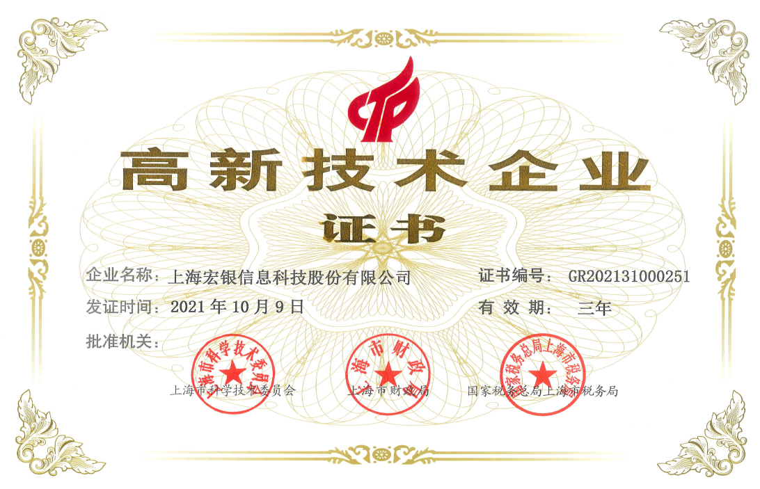宏銀信息收到了由上海市科學(xué)技術(shù)委員會(huì)、上海市財(cái)政局、國家稅務(wù)總局上海市稅務(wù)局聯(lián)合頒發(fā)的《高新技術(shù)企業(yè)證書》,這是繼2015年首次申報(bào)成功以來,再次復(fù)審?fù)ㄟ^。